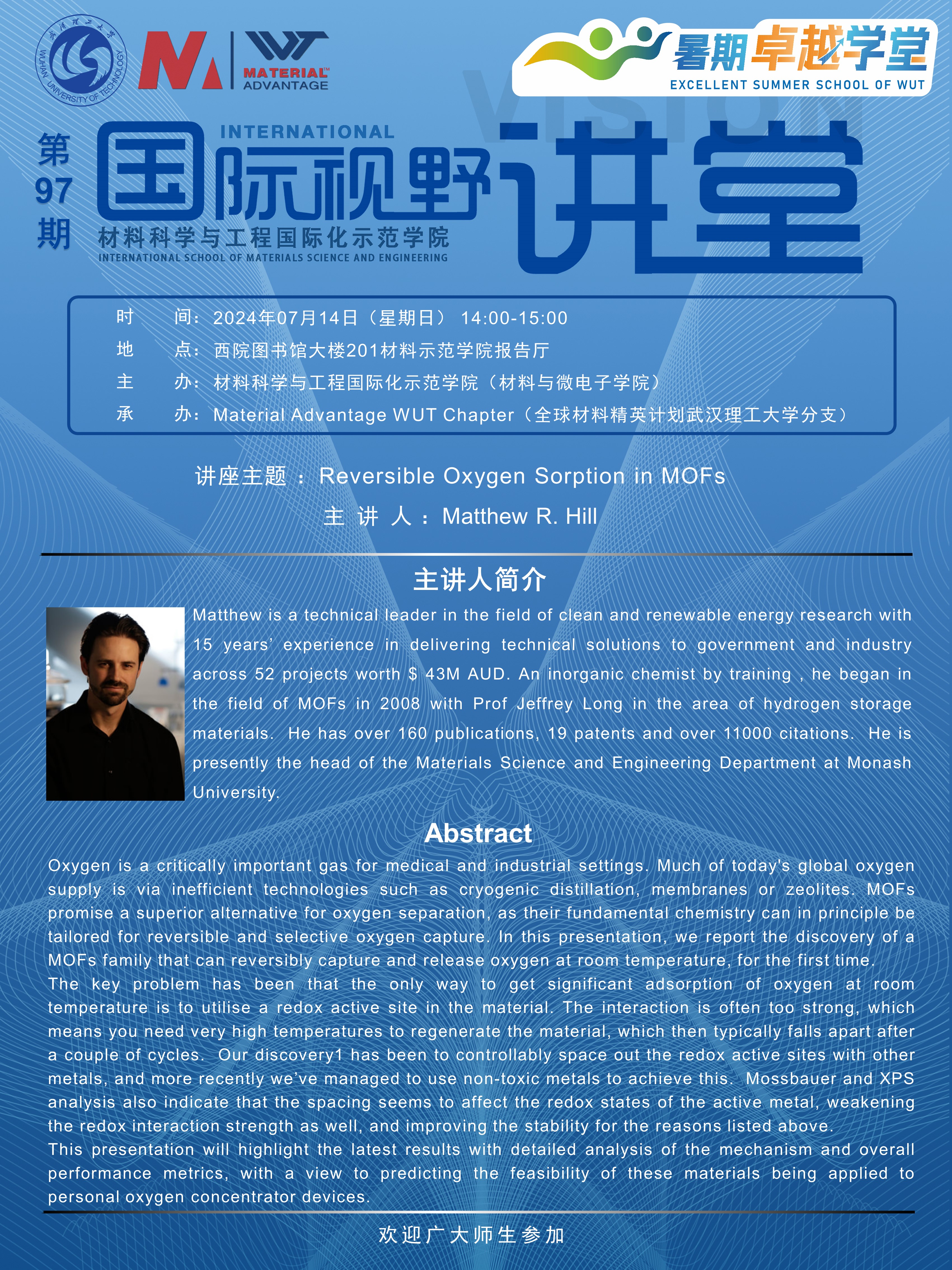 【williamhill中文官网暑期卓越学堂】国际视野讲堂第97期:Reversible Oxygen Sorption in MOFs
