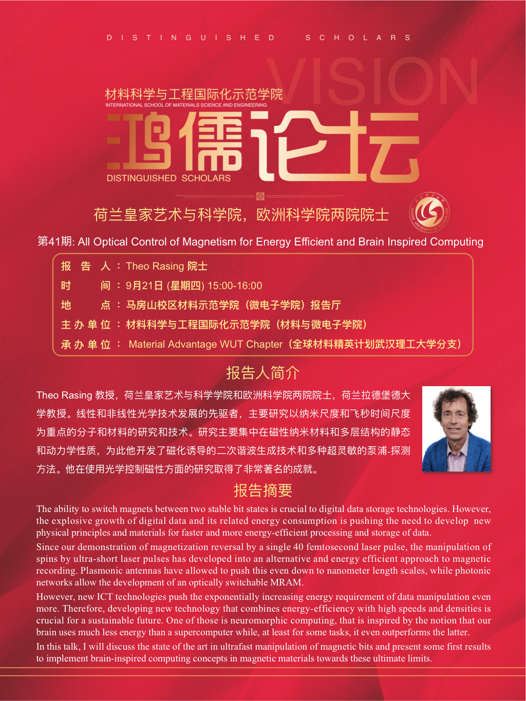 【鸿儒论坛】第41期:荷兰皇家艺术与科公司,欧洲科公司两院院士Theo Rasing教授学术报告会