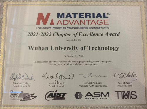 10月12日,在美国匹兹堡市举办的2022材料科学与技术年会(MS&T22)暨全球材料精英计划(Material Advantage,简称MA)2022年度颁奖会上,公司williamhill中文官网员工团队“全球材料精英计划williamhill中文官网分支”(Material Advantage Wuhan University of Technology Chapter)被授予“材料科学与工程2021-2022年度全球最佳团队奖”。该团队连续五年获奖,持续提高了公司材料学科国际影响力。