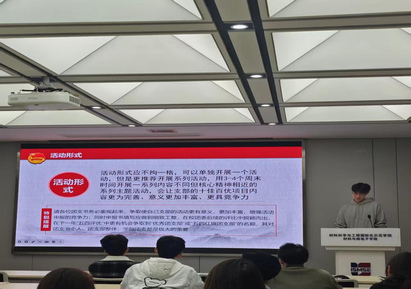 随后,杨宇恒就“如何有效开展‘十佳百优’特色团建项目”作了专题辅导。他从项目选题、方案设计、过程实施到成果总结,进行了系统而详尽的讲解。杨部长建议,各支部应紧密结合专业特色与时事热点,找准切入点,设计出既有思想引领性、又具吸引力和可操作性的特色活动,避免活动流于形式,真正做到“一团一品”,让团建工作生动起来、活跃起来。