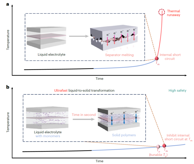 高温下隔膜失效引发的锂金属电池短路问题,是制约电池热安全的关键挑战。本研究提出一种热响应电解液,在受热时发生快速液-固相转变,为提升锂金属电池的安全性提供了高效策略。单体通过阳离子聚合,在接近隔膜熔点的温度阈值下,可在数秒内完成固化。这种快速相变能形成有效的热屏障,阻止内部短路与热失控的发生。该电解液可保证电池在高温90℃下稳定运行,同时热固化后仍可支持电池正常工作。其可调控的相变温度能够适配多种商用隔膜。这种超快热响应电解液为设计安全型电池提供了新途径。
