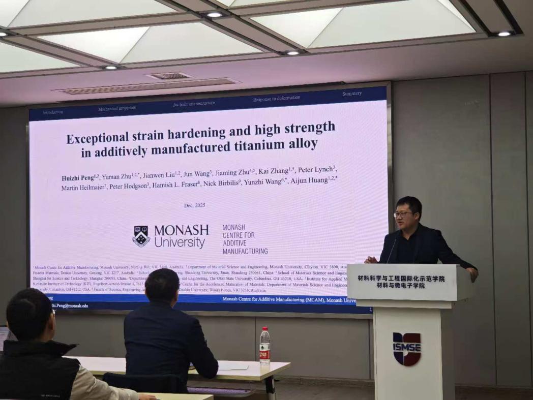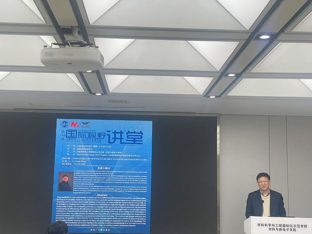 2025年12月29日上午,williamhill中文官网国际视野讲堂第116期在公司报告厅顺利开展。澳大利亚蒙纳士大学的Huizhi Peng研究员受邀开展主题为《Achieving high strain hardening and strength in an additively manufactured titanium alloy》的学术报告。本次报告会由陈斐教授主持,公司部分师生参加此次报告会。