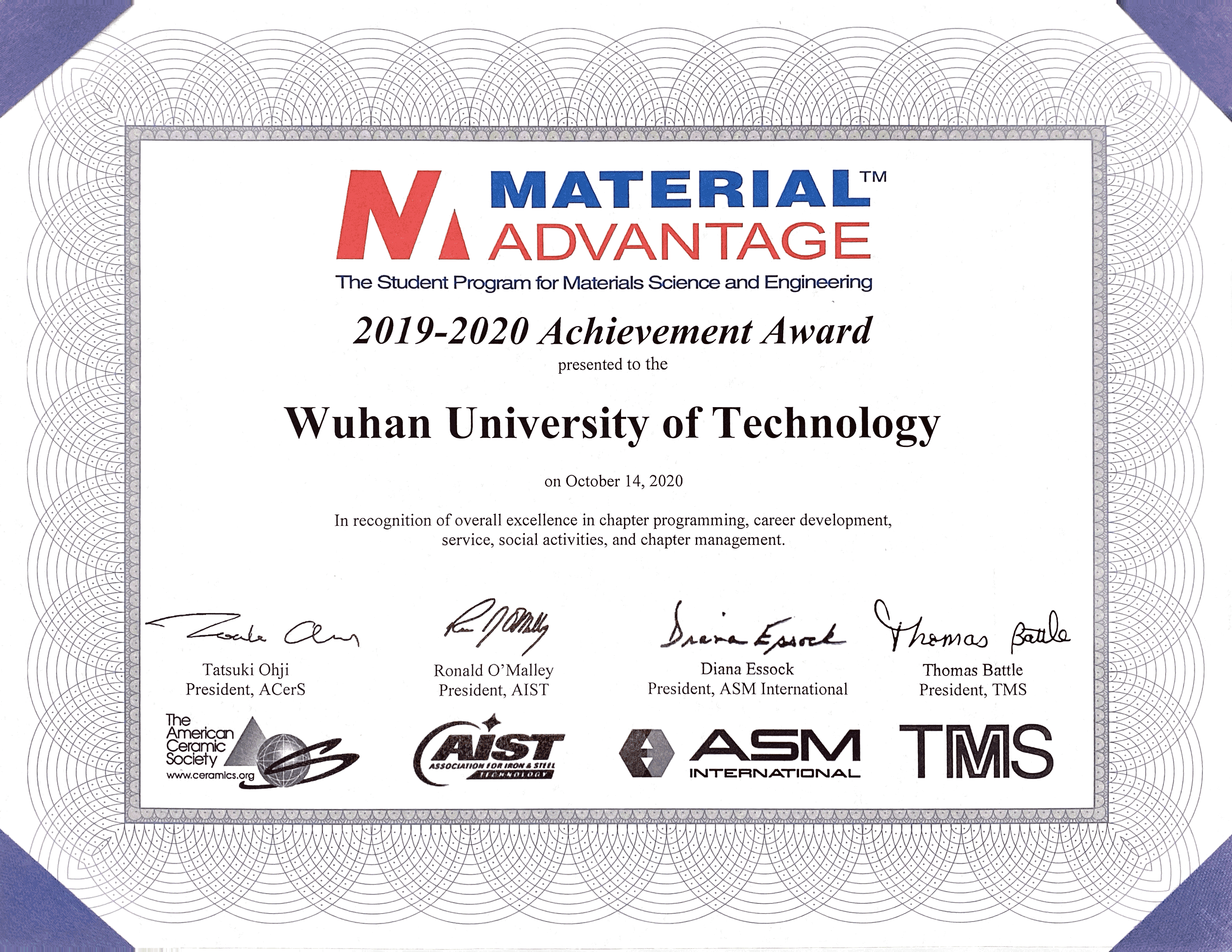 “材料科学与工程全球最佳员工团队成就奖”是由国际材料研究领域四大学会(美国陶瓷协会,美国钢铁联合科技协会,美国金属学会,美国冶金矿物协会)共同认证并颁发给全球MA员工团队的奖项,以表彰团队在材料学科相关的科技项目开展、职业规划、服务宣传等方面的成就。受疫情影响,2019-2020年度颁奖于线上举行。在评选中,“全球材料精英计划williamhill中文官网分支”从全球101支参评团队中脱颖而出,成为今年获得该奖项的唯一一支中国员工团队。