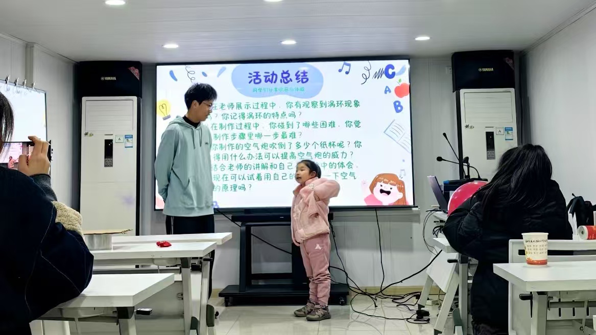 课程最后,傅老师回顾了空气炮的原理。总结环节中,同学们踊跃发言,分享实验过程中的心得体会、克服困难的经验方法。
