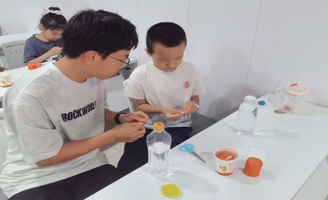 实验结束后,姜老师带领同学们探索最终难题,如何让物体在水中自由升降而不改变浮力。姜老师以蛟龙号潜水艇为例,指导同学们通过改变自身重量实现水中升降。员工们用塑料瓶、吸管等材料自制简易潜水艇,在实验中体验到浮力的趣味。